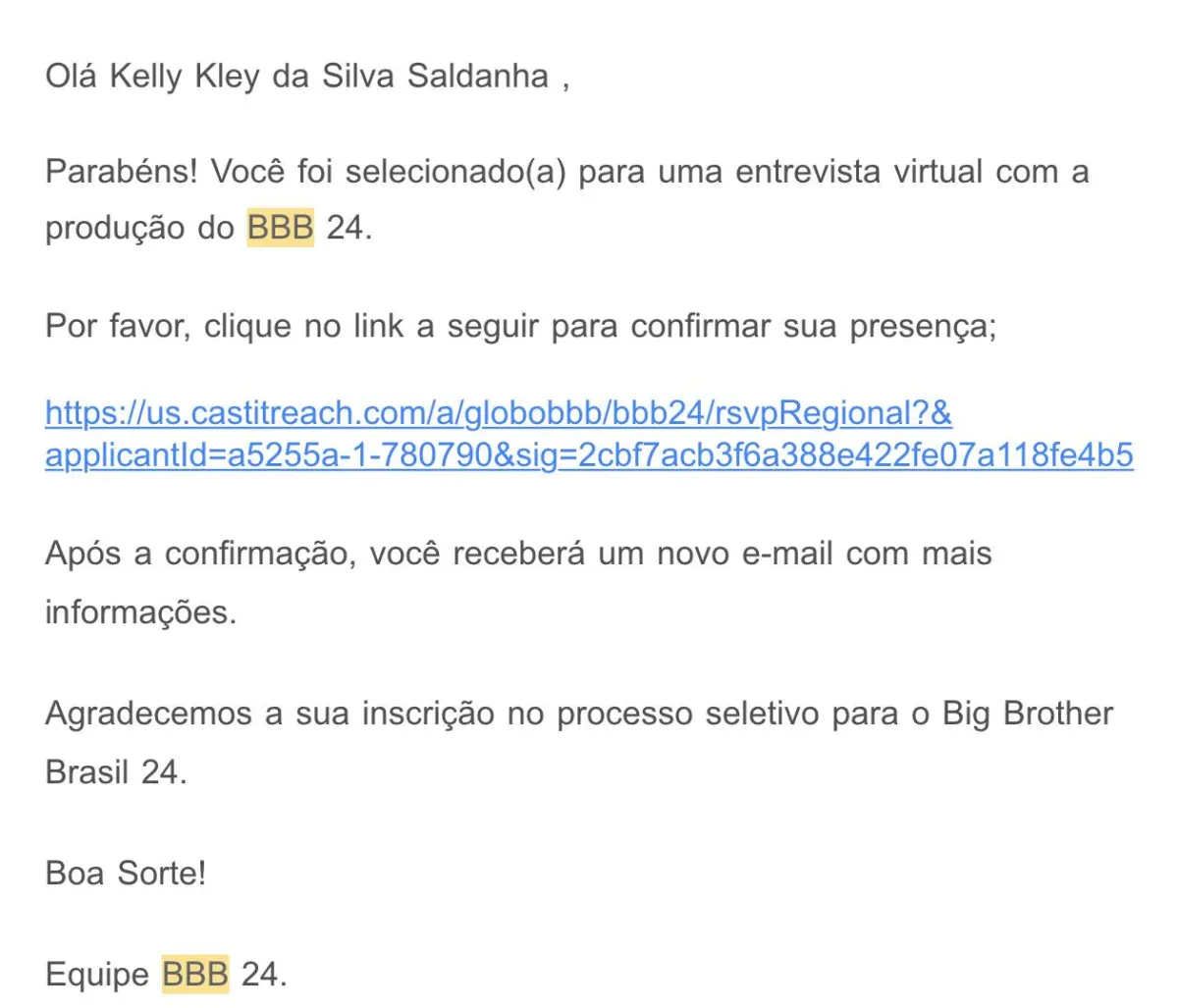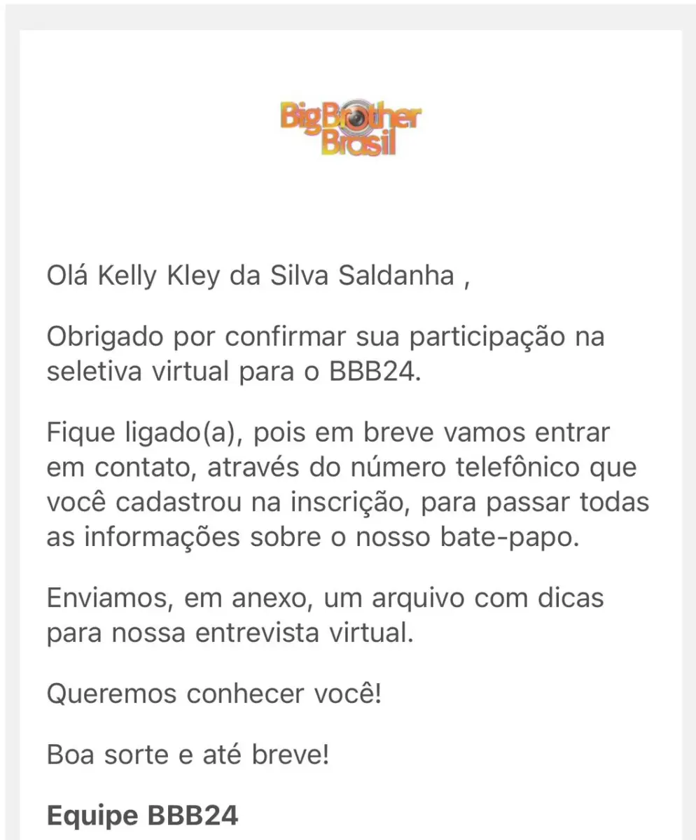“No começo de julho, chegou o e-mail comunicando que eu havia sido selecionada, para eu confirmar a participação na entrevista. Depois que confirmei, a produção ligou passando as informações, o dia da entrevista e o canal que ia ter direto com eles, como a informação de que ninguém poderia ficar sabendo, porque então seria desclassificada, assim como a informação de que eu estava sendo monitorada por eles”, contou Kelly.