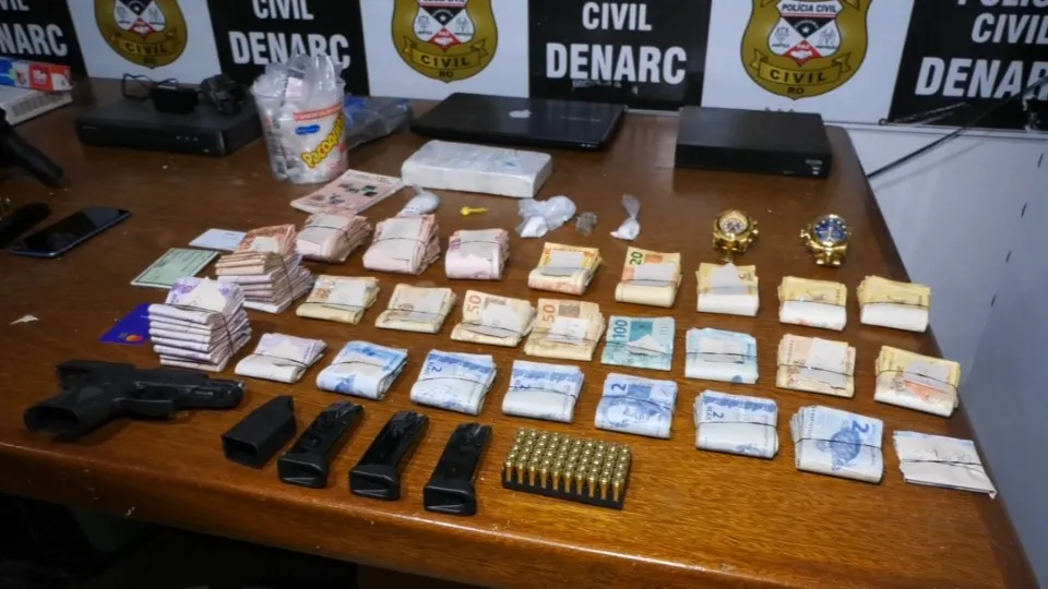 Os agentes apreenderam quatro armas de fogo, R$ 18 mil em espécie. Além disso, várias porções e tabletes de drogas foram apreendidos.