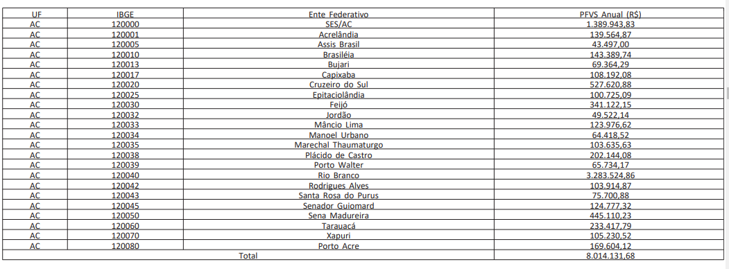 Do total, o município com o maior repasse é a capital Rio Branco, com cerca de R$ 3 milhões.