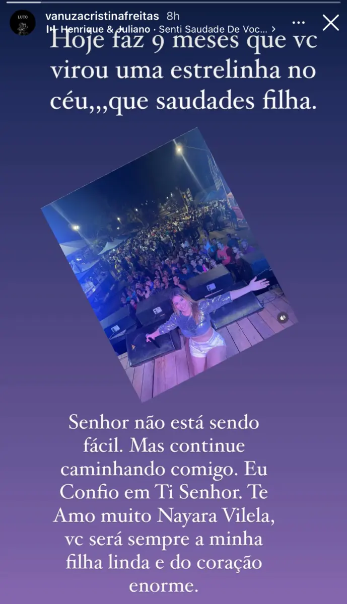 Nas redes sociais, a mãe de Nayara Vilela relembrou a morte da filha e fez um desabafo. “Hoje faz 9 meses que você virou uma estrelinha no céu. Que saudades, filha. Senhor, não está sendo fácil. Mas continue caminhando comigo. Eu confio em Ti, Senhor. Te amo muito, Nayara Vilela. Você será sempre a minha filha linda e de coração enorme”, escreveu a mãe de Nayara na legenda da publicação que leva a foto da filha.