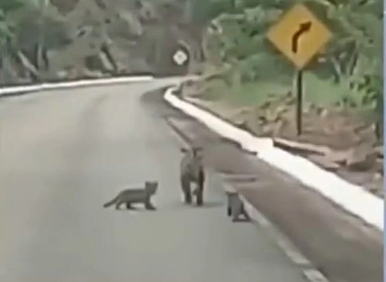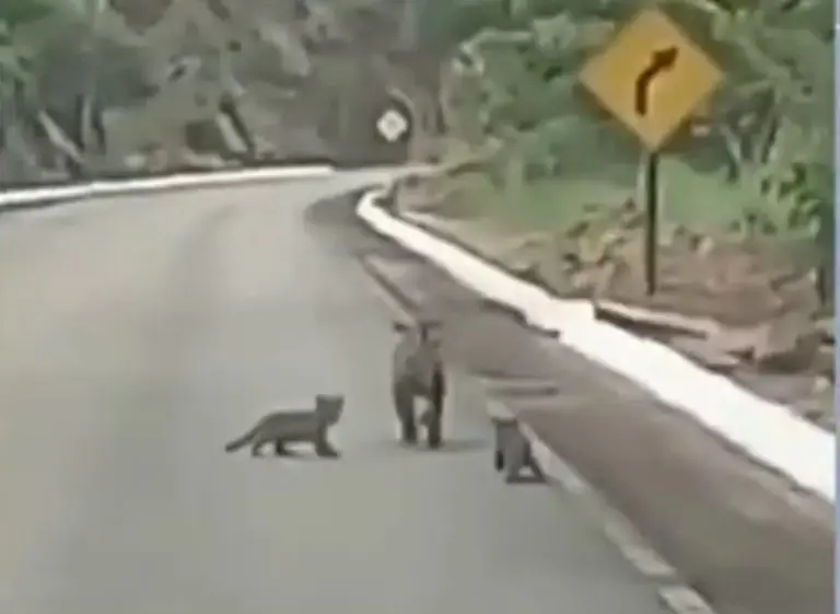 Pelas imagens é possível ver que as onças aparecem caminhando na pista da rodovia, mas ao perceberem a aproximação do carro, elas correm para dentro da mata e buscam se esconder, como um instinto de proteção da mãe com os filhotes.