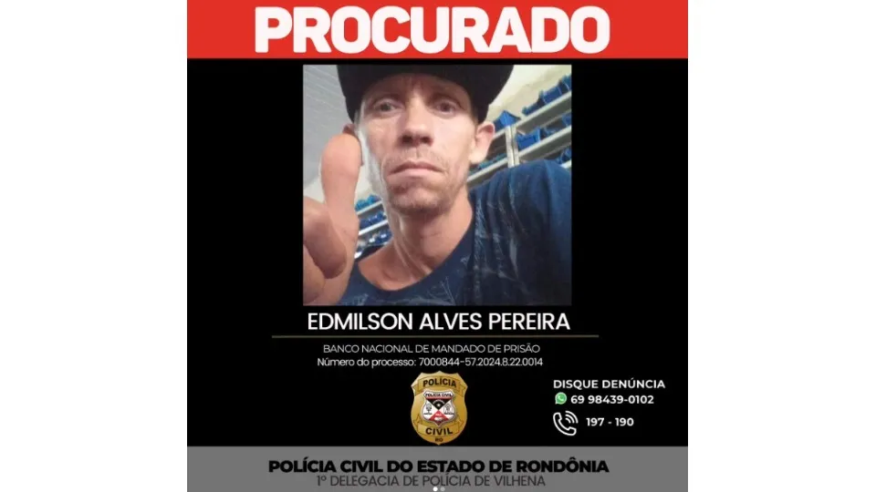 A Polícia Civil de Rondônia está em busca de Edmilson Alves Pereira, suspeito de feminicídio da vítima Solange Evangelista Dias, ocorrido em Chupinguaia-RO, no último dia 26 de janeiro. O homem, atualmente foragido, possui mandado de prisão preventiva em aberto e conseguiu evadir-se antes de ser localizado.