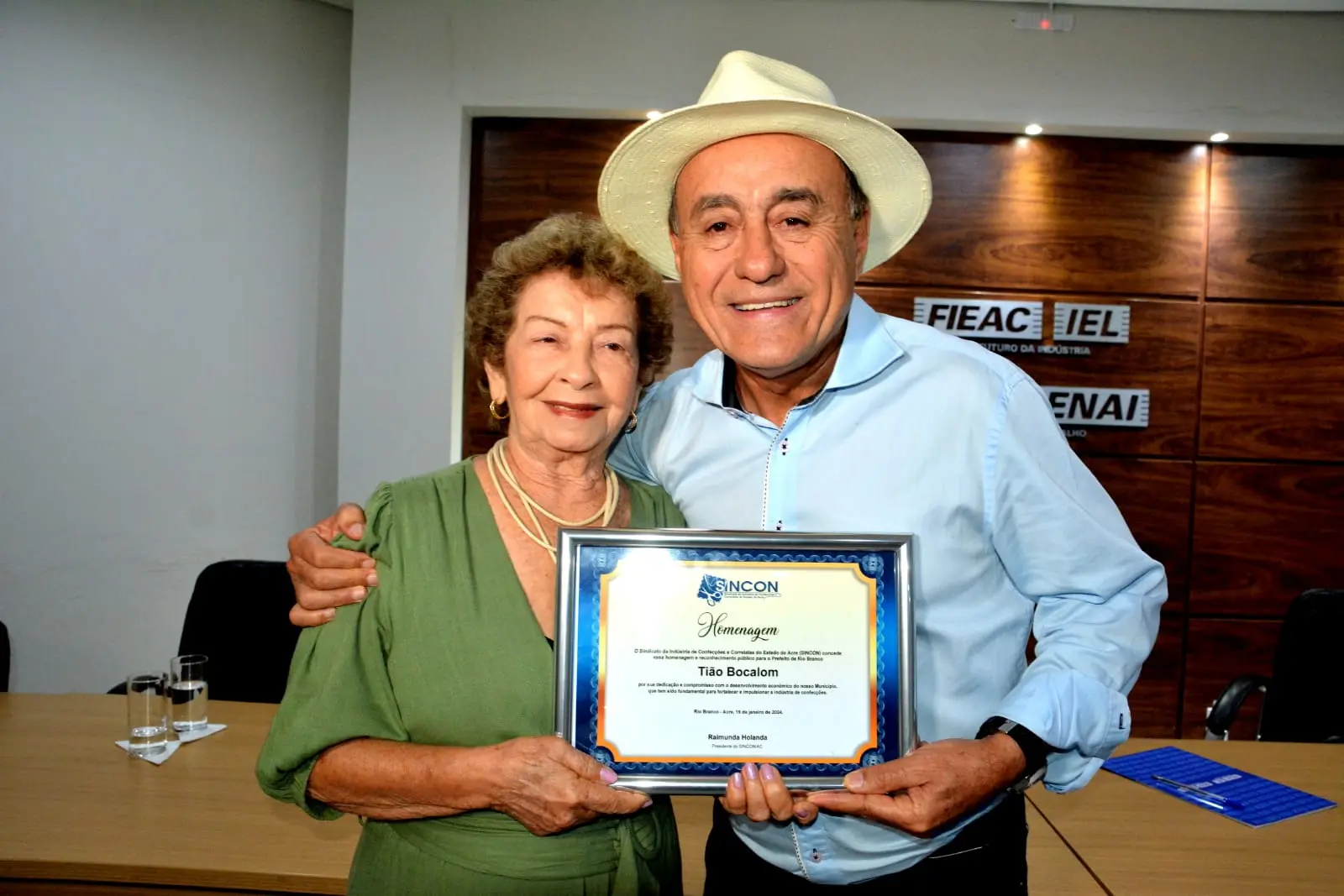 O prefeito de Rio Branco, recebeu nessa sexta-feira (19), na Federação das Indústrias do Estado do Acre (Fieac), uma homenagem do Sindicado das Indústrias de Confecções e Correlatas do Estado do Acre (SINCON), pela gestão ter escolhido as malharias locais para a confecção dos uniformes das escolas municipais distribuídos gratuitamente, pela primeira vez, aos alunos.