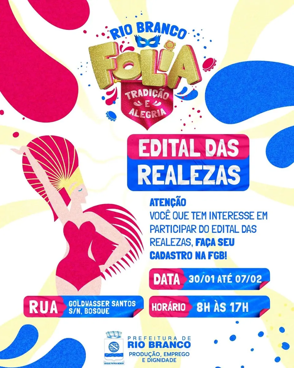A Prefeitura Municipal de Rio Branco lançou oficialmente, na tarde desta quinta-feira (25), o aguardado edital para o Concurso das Realezas do Carnaval 2024. Os interessados em participar devem realizar o cadastro na Fundação Garibaldi Brasil, localizada na rua Goldwasser Santos no Bosque, no período de 30/01 a 07/02, das 8h às 17h.