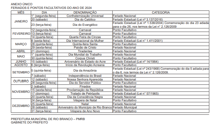 A Prefeitura de Rio Branco publicou no Diário Oficial do Estado desta terça-feira (9) o calendário oficial de feriados municipais, estaduais e federais, além dos pontos facultativos de 2024.