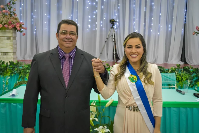 Carlinhos do Pelado e Fernanda Hassem durante posse do 2º mandato/Reprodução