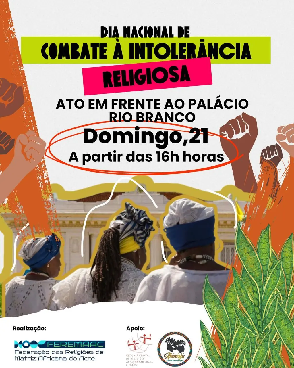 A Federação das Religiões de Matriz Africana do Acre (Feremaac) realiza no próximo domingo (21) um ato público em frente ao Palácio Rio Branco, a partir das 16h, em alusão ao Dia Nacional de Combate à Intolerância Religiosa.
