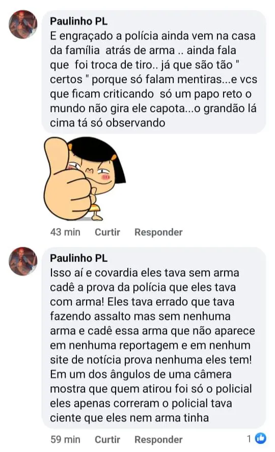 Revoltados, familiares de assaltantes baleados pedem esclarecimentos nas redes sociais
