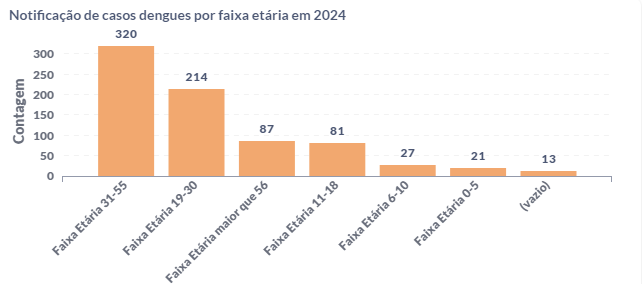 Em relação à faixa etária, a população entre 31 e 55 anos foi a mais infectada. Em seguida, aparece a população com idade entre 19 e 30 anos. Já as pessoas idosas, onde a dengue é mais preocupante, figurou em 3º lugar entre as mais infectadas.