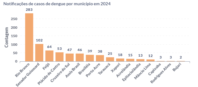 Em relação aos municípios, a capital Rio Branco lidera o ranking. Do total, foram 283 notificações registradas. Em seguida, Senador Guiomard, distante 25 km da capital. O município teve 102 notificações da doença em 11 dias.