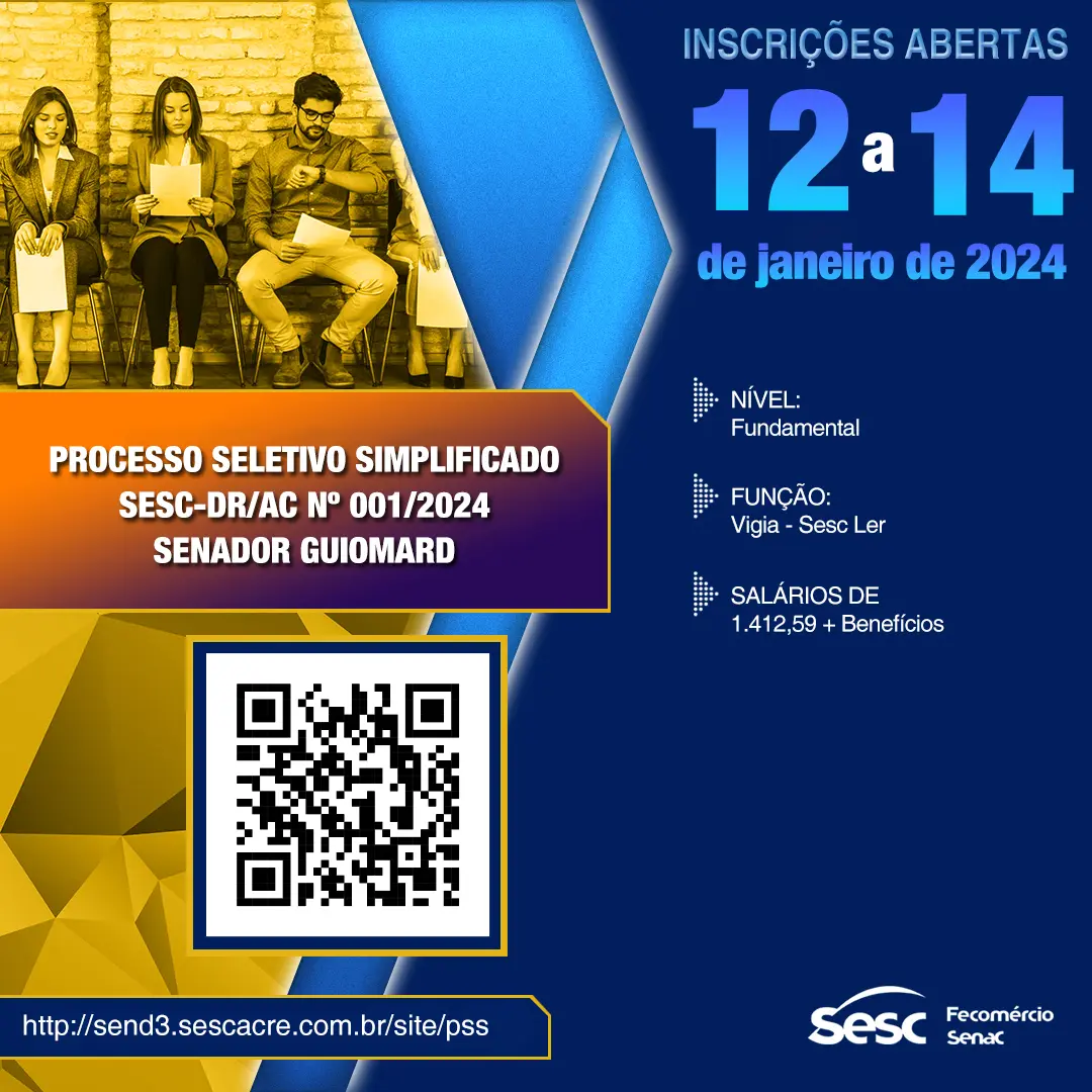O Serviço Social do Comércio no Acre (Sesc no Acre) abre processo seletivo simplificado para a contratação de vigia na unidade do Sesc em Senador Guiomard. As inscrições podem ser realizadas através do site www.sescacre.com.br , a partir dessa sexta-feira, 12 ,com encerramento no domingo, dia 14.