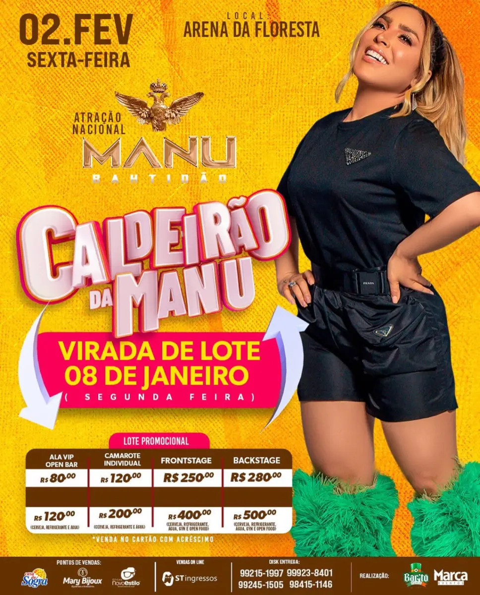 A organização anunciou que amanhã acontece a virada de lote. Quem ainda não garantiu os ingressos para curtir o show de Manu Bahtidão tem até hoje (8 de janeiro) para adquiri-los antes da virada do lote.
