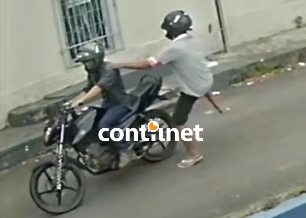 Um vídeo do circuito de monitoramento de uma empresa, mostra uma dupla em um motocicleta, transitando na contra mão de uma rua ao lado da Avenida Getúlio Vargas, próximo à ladeira da Maternidade.