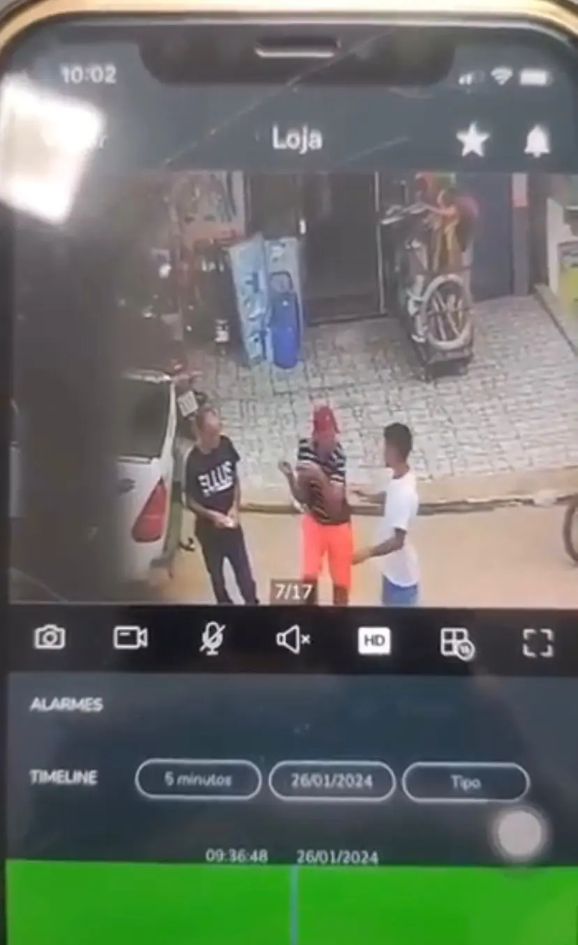 A ação criminosa foi registrada por câmeras de segurança, que mostram o momento exato em que a vítima está parada em frente a um estabelecimento comercial e o agressor se aproxima por trás, desferindo a facada logo em seguida.