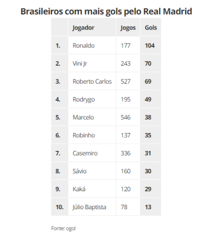 Apenas Ronaldo Fenômeno, com 104 gols, está à frente. Vini Jr, que deixou Roberto Carlos para trás, alcançou os 70 após 243 partidas, em 16.745 minutos em campo. Isso dá pouco mais de 239 minutos para marcar um gol, em média.