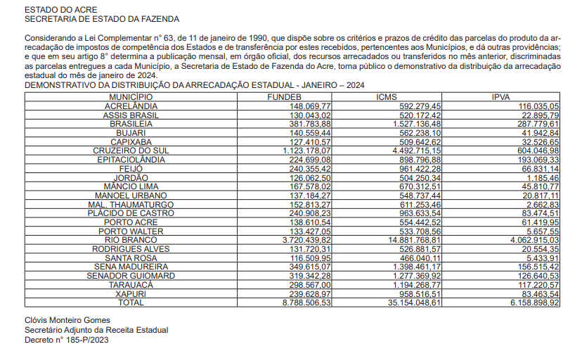 A Secretaria de Estado da Fazenda (Sefaz) publicou no Diário Oficial do Acre desta quinta-feira (15), o demonstrativo da arrecadação de impostos que o estado teve só em janeiro deste ano. A pasta divulgou os números de arrecadação de IPVA, ICMS e do Fundeb.