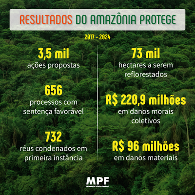 As três fases do projeto já desenvolvidas resultaram no ajuizamento de mais de 3,5 mil ações contra os responsáveis pela retirada irregular de vegetação em áreas superiores a 60 hectares, registradas pelo Projeto de Monitoramento do Desflorestamento na Amazônia Legal (Prodes/Inpe) entre agosto de 2015 e dezembro de 2019. Desse total, 656 processos já tiveram sentença favorável ao MPF e 732 réus foram condenados em primeira instância a pagar indenizações, além de reparar os danos causados pela remoção ilegal de floresta. Mais de 73 mil hectares de mata deverão ser reflorestados, o que equivale a quase 68 mil campos de futebol.