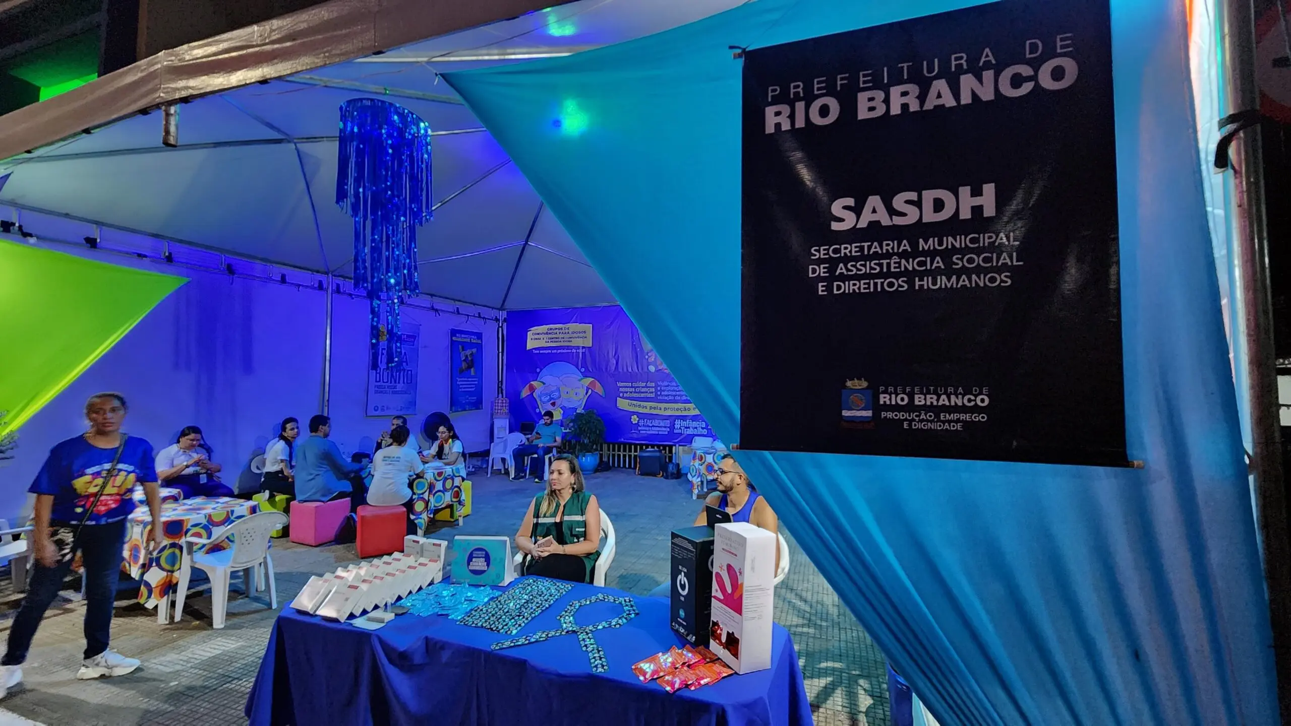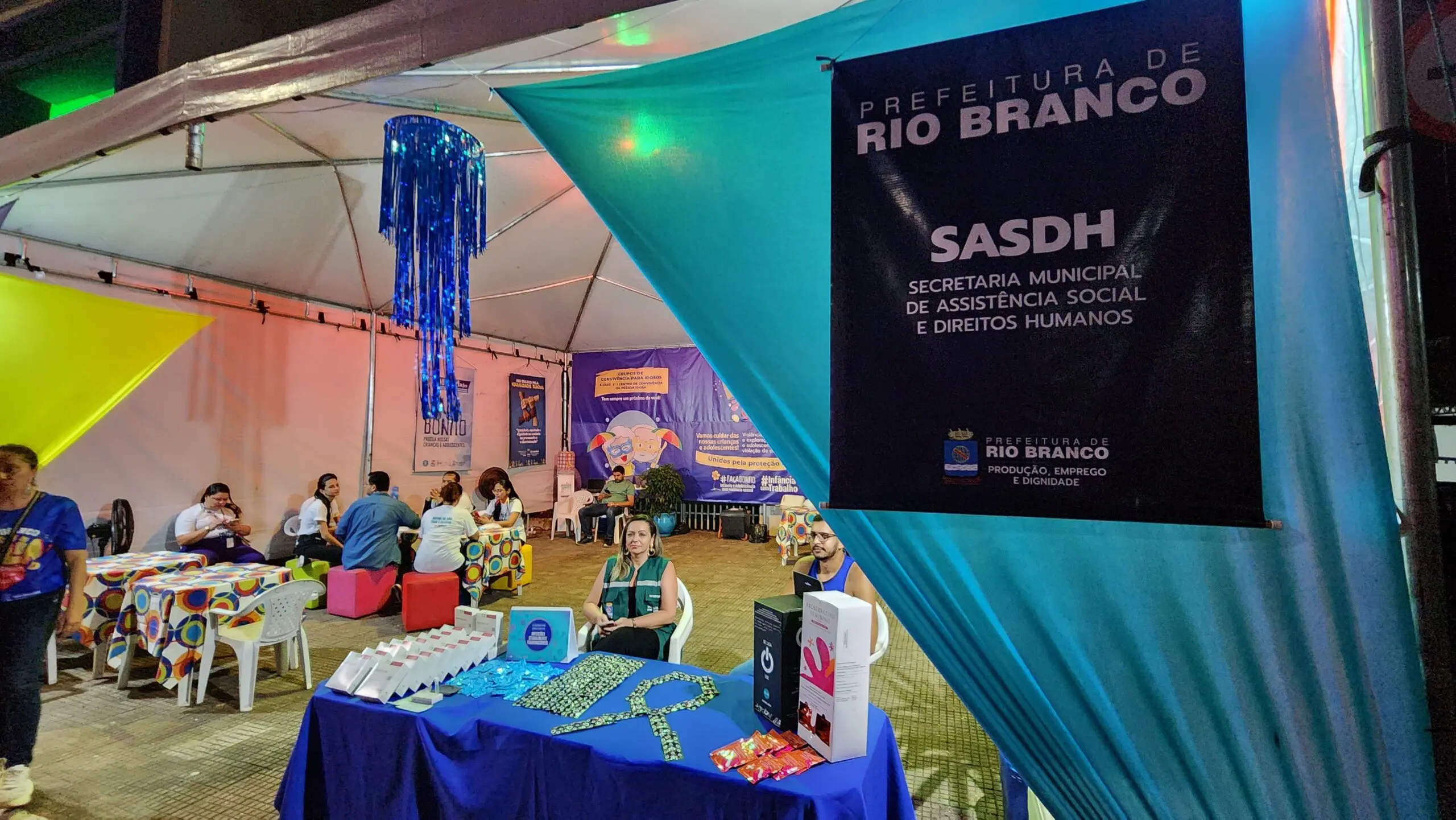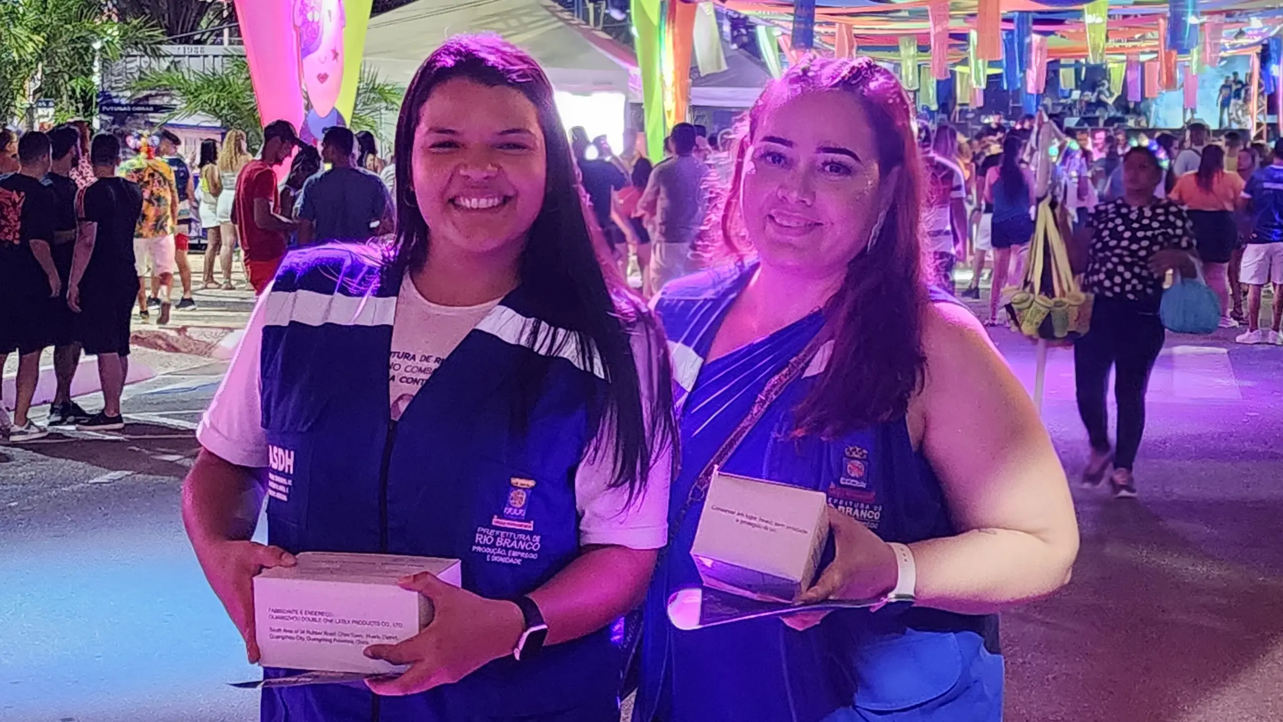 Logo na entrada do Carnaval de Rio Branco, preservativos masculinos e femininos, gel lubrificante e autotestes rápido de HIV são destribuídos gratuitamente. Nas duas primeiras noites, cerca de 100 testes e mais de 6 mil preservativos foram distribuídos, segundo a equipe da Saúde do município.