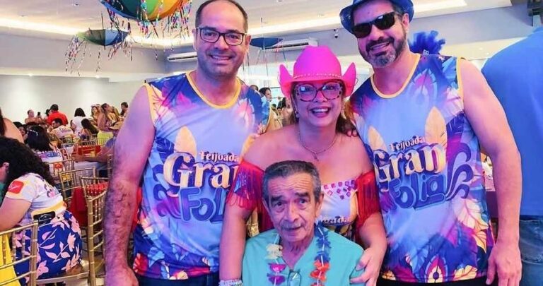 Os manos Nágila, Jackson e Jefson Dourado com o pai na Feijoada do Gran Reserva no domingo de carnaval.