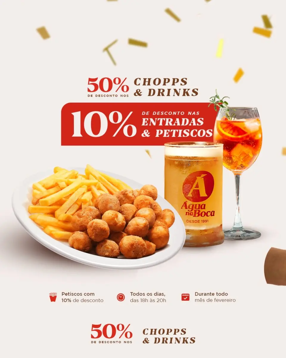 Comer e beber bem no Carnaval é essencial, além da diversão. Na Pizzaria e Restaurante Água na Boca, neste Carnaval, o desconto será em entradas e chopps e drinks.