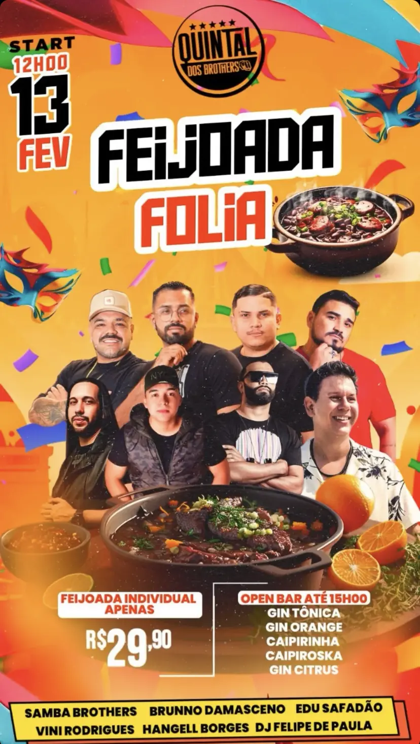 A Feijoada Folia iniciou ao meio dia desta terça-feira e terá 16 horas de festa, com open bar e muita música ao vivo.