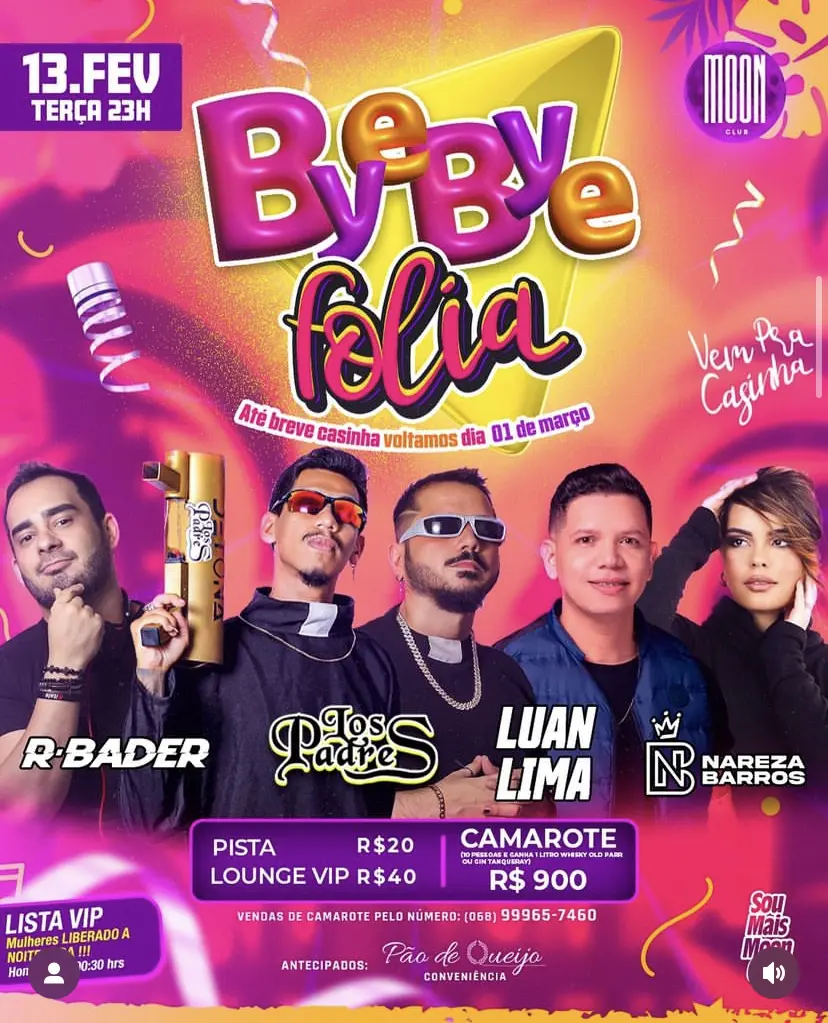 O Bey Bye Casinha em uma das boates mais badaladas de Rio Branco inicia às 23h e tem como atrações os cantores Luan Lima, e os DJ Nareza Barros, Los Padres e Richard Bader.