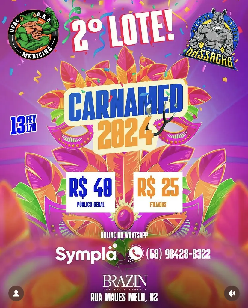 A festa inicia às 17h, com entrada de R$ 40 para público em geral e R$ 25 para filiados das atléticas Sinistra e Massacre.