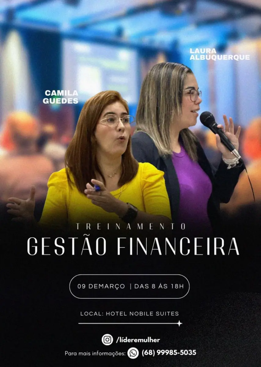 As consultoras Camila Guedes, de 34 anos, e Laura Albuquerque, de 33 anos, anunciaram a realização de um treinamento de gestão financeira para empresários e profissionais da área financeira que buscam se aprimorar e saber mais sobre administração de empresas. Com 15 anos de experiência, as consultoras são proprietárias da Líderemulher, uma empresa que auxilia na gestão financeira de empresas acreanas.