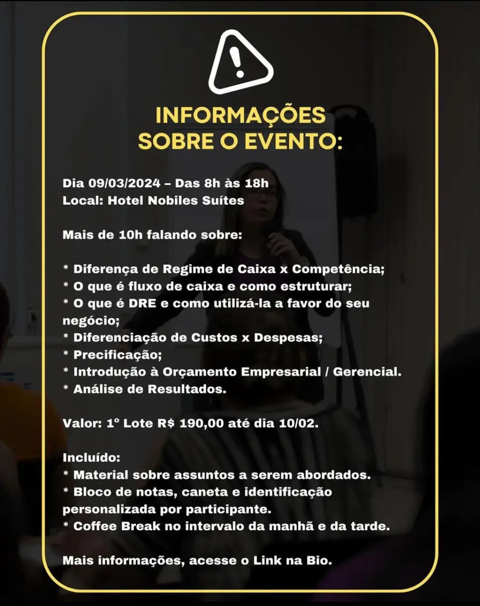 Dentro do valor de inscrição está incluído o material sobre assuntos a serem abordados, bloco de notas, caneta e identificação personalizada por participante e coffee break no intervalo da manhã e da tarde.