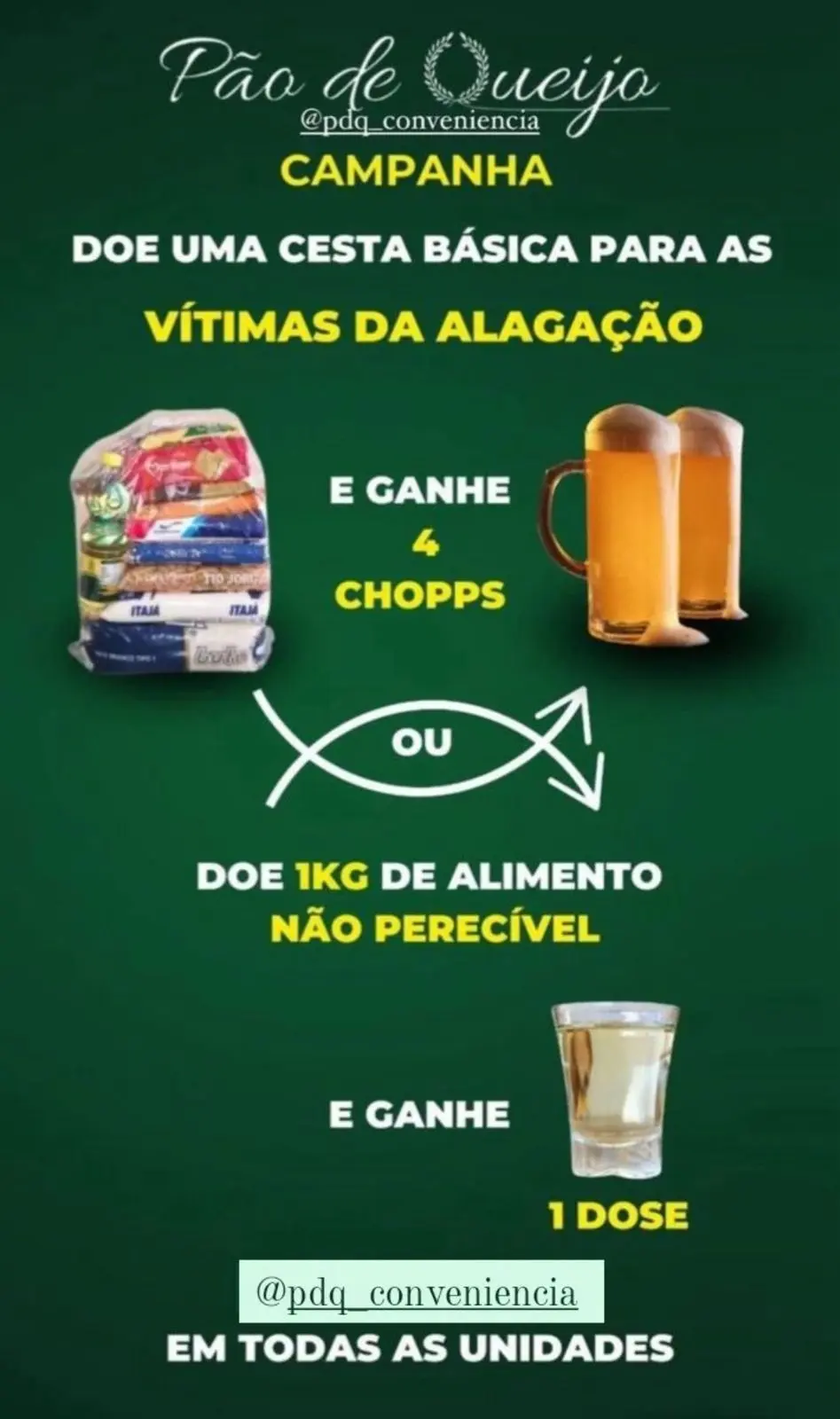 Quem decidir doar uma cesta básica, ganha quatro chopps oferecidos pela conveniência. Já para aqueles que doarem um 1kg de alimento não perecível, a Pão de Queijo vai oferecer uma dose de bebida.