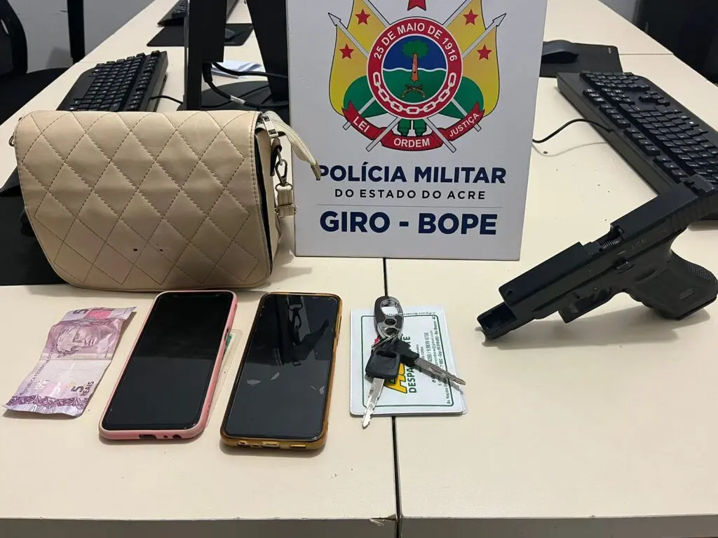 Durante a abordagem, os policiais identificaram com dupla, um simulacro de arma de fogo, modelo Glock, e os pertences das vítimas: dois celulares e uma bolsa.