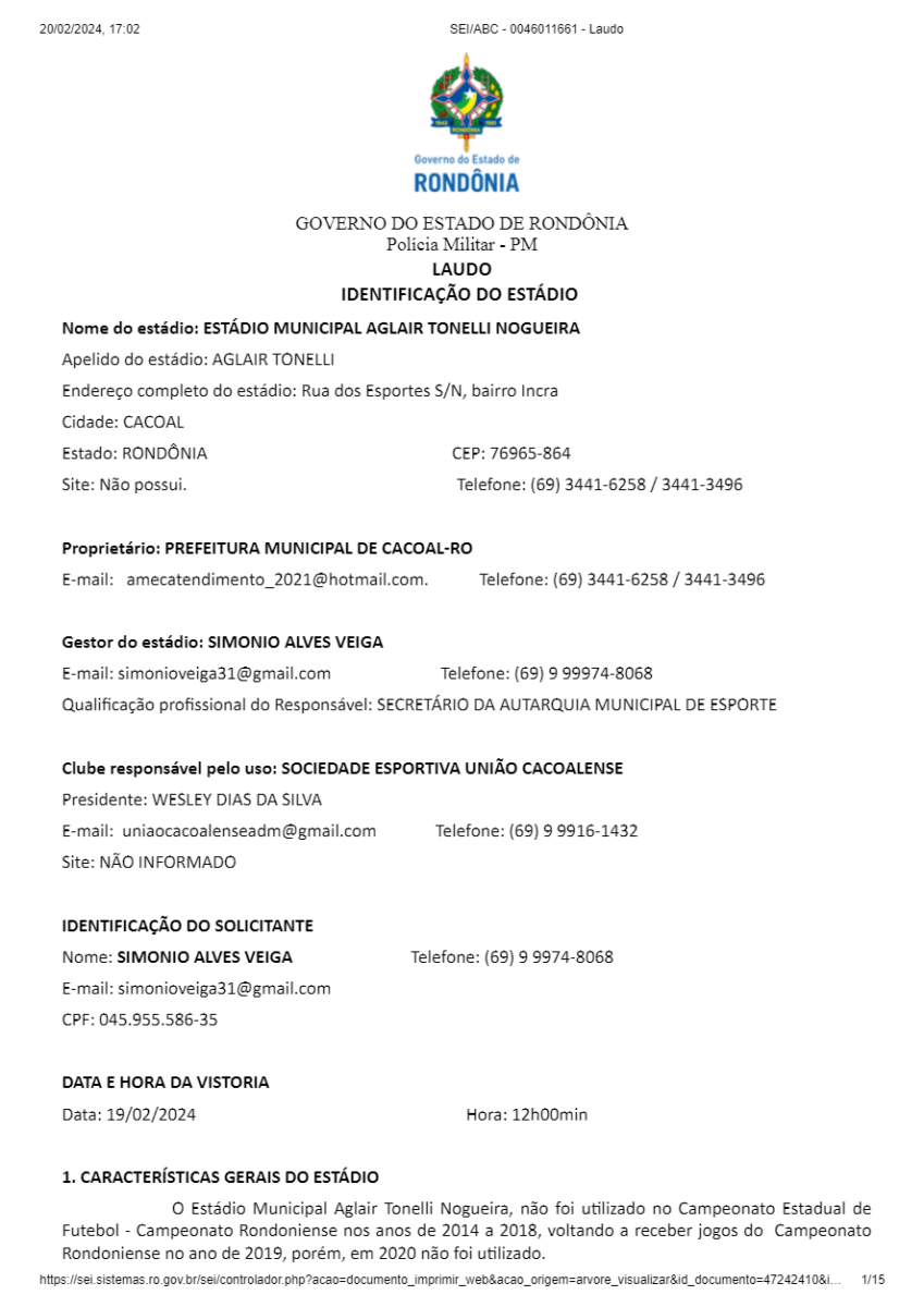 O Estádio Municipal Aglair Tonelli Nogueira, localizado em Cacoal, Rondônia, passou por uma vistoria de segurança realizada pela Polícia Militar no dia 19 de fevereiro de 2024. O laudo, divulgado no dia seguinte, aponta que o estádio foi aprovado com restrições.