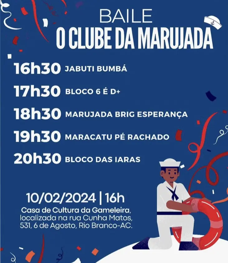 Com mais de sete décadas de tradição no Carnaval do Acre, a Marujada Brig Esperança promove neste sábado (10/02), a partir das 16h, o Baile “O Clube da Marujada”, na Casa de Cultura da Gameleira. O evento apresenta uma programação que reúne o que há de melhor na cultura popular acreana. Destacam-se entre os grupos populares do estado o Jabuti Bumbá, o Maracatu Pé Rachado, o Bloco das Yaras e o Bloco 6 é D+, contribuindo para enriquecer ainda mais a festividade. Após as apresentações, seguimos a programação com o DJ Guinomo, que traz um repertório no clima de carnaval.