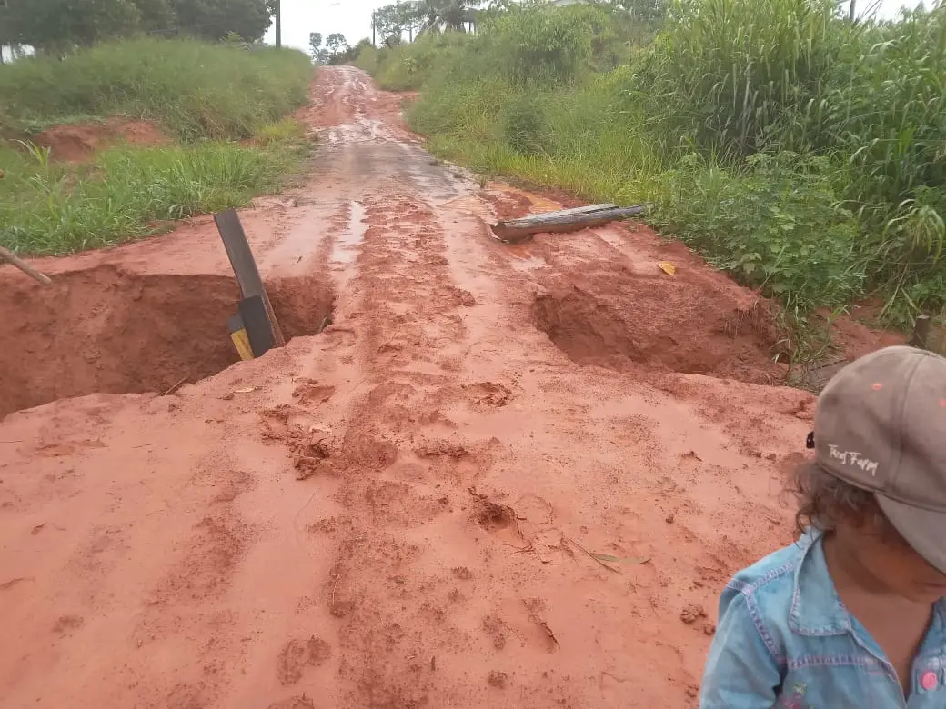 Comunidade Aurora, Km 75, cerca de 50 famílias atingidas, 07 pontes caídas, comunidade parcialmente isolada.