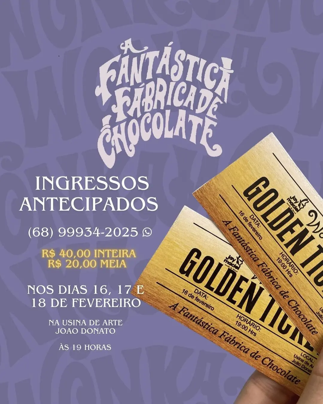 Nos dias 16, 17 e 18 de fevereiro na Usina de Arte João Donato, contaremos a história de um pequeno grupo de crianças que encontraram seus convites dourados e ganham o incrível passeio em uma fantástica fábrica. O que será que esse passeio reserva para eles? Garanta seu “convite dourado” e vem descobrir a gente tudo que acontecerá dentro da Fantástica Fábrica de Chocolate. Entrada inteira por R$40,00 e meia por R$20,00.