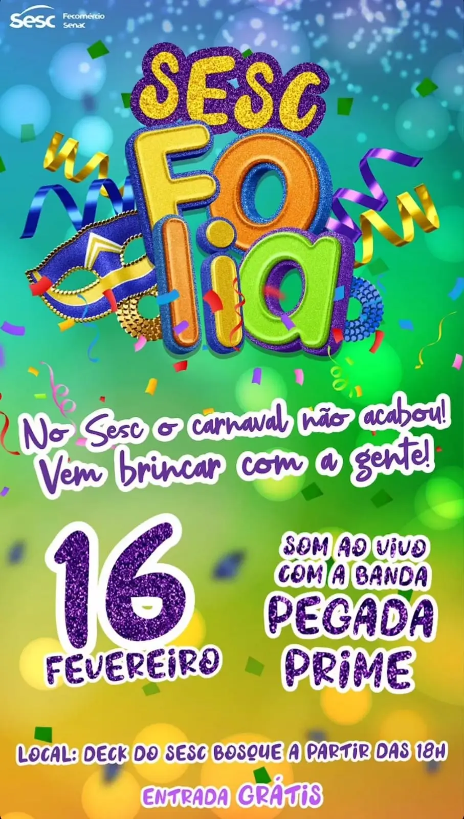 “Sesc Folia” com mais carnaval e entrada grátis! Com som ao vivo com a banda Pegada Prime na sexta-feira (16).