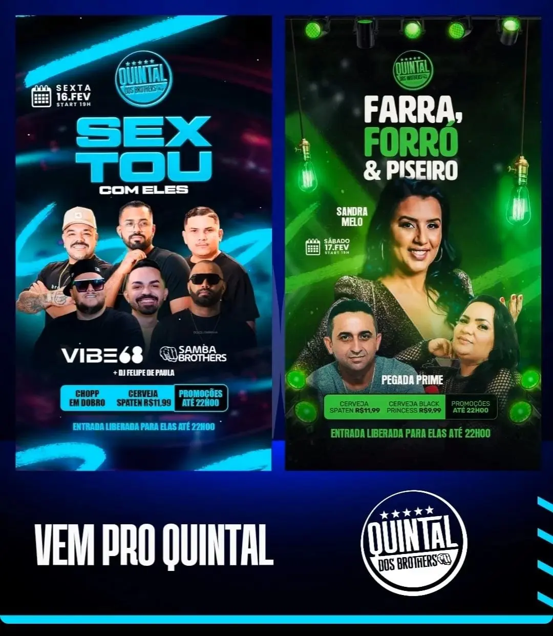 Programação do Quintal dos Brothers com Vibe68 e Samba Brothers na sexta (16). “Farra, Forró e Piseiro” com Sandra Melo e Pegada Prime no sábado (17). Todos os dias com promoções de bebidas e entrada liberada até às 22h.