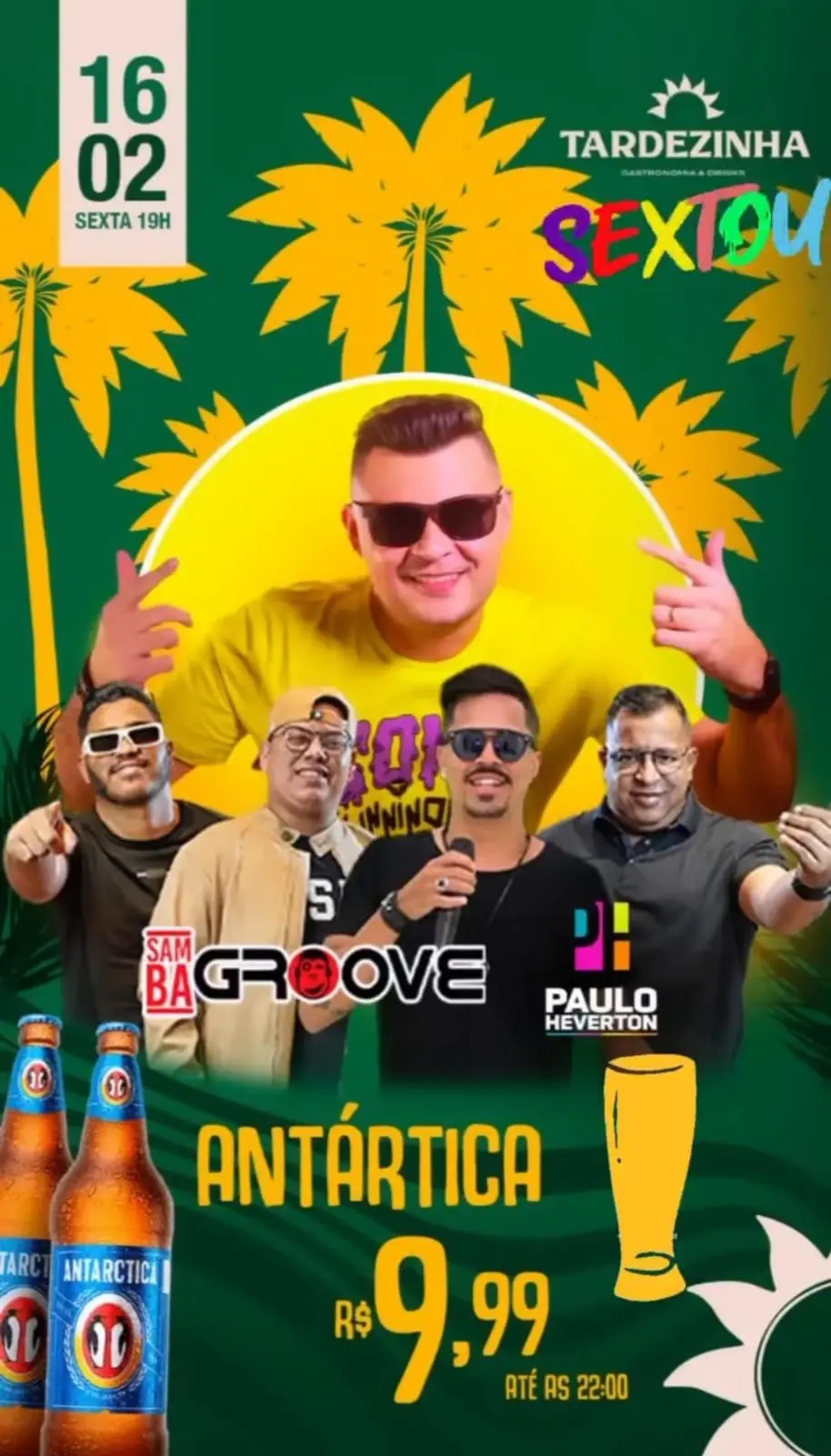 “Sextou” (16) no Tardezinha com a banda Samba Groove e Paulo Hewerton a partir das 19h com promoção de cerveja antártica a R$9,99 até às 22h.