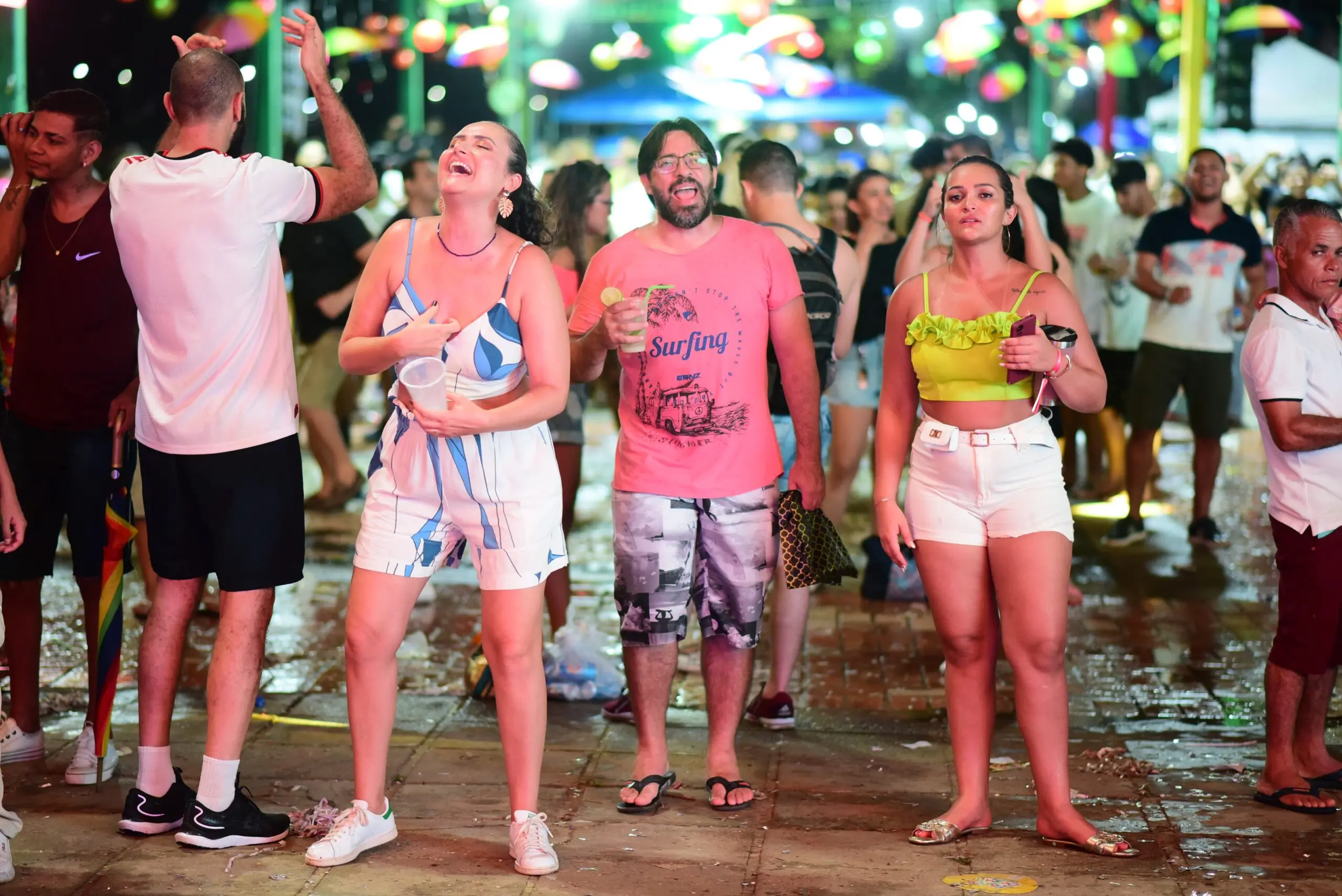 Foliões curtem primeira noite de Carnaval em meio à chuva no Centro de Rio Branco