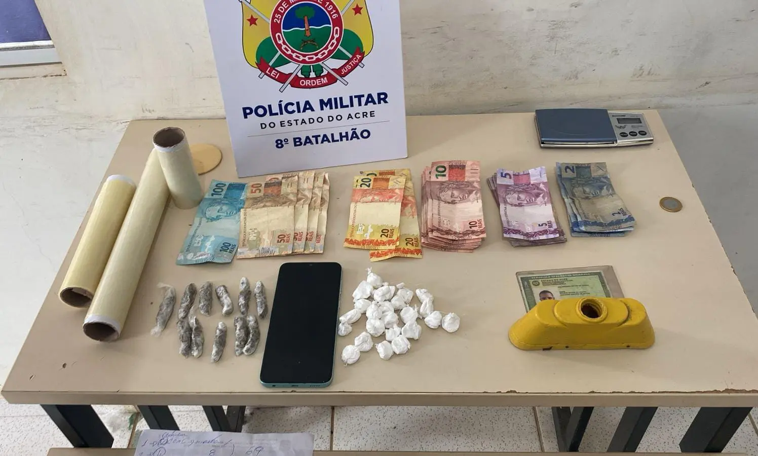 Ao procederem com a abordagem e buscas, os militares localizaram 11 porções de uma substância esverdeada aparentando ser maconha e 24 invólucros de substância aparentando ser cocaína.