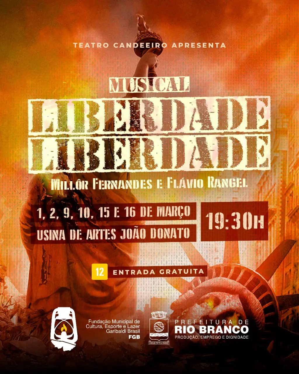 O musical “Liberdade, Liberdade” de Millôr Fernandes e Flávio Rangel, sob direção de Jaqueline Chagas e produção do Teatro Candeeiro, retorna aos palcos em março para a sua segunda temporada. O musical estreou em Maio de 2022 na capital acreana e levou desde então mais de 2 mil pessoas ao teatro, desta vez, com apresentações totalmente gratuitas o musical promete alcançar muito mais.