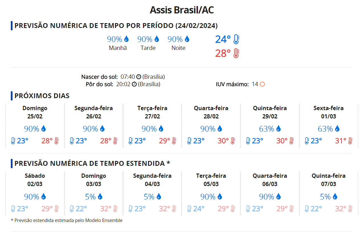 A previsão do tempo para os municípios de Cruzeiro do Sul, Assis Brasil e Brasiléia mostra que, a princípio, pelas próximas duas semanas (período até 07 de março), deverá ter precipitação em quase todos os dias. As informações são do site do Centro de Previsão de Tempo e Eventos Climáticos (CPTEC), em parceria com o Instituto Nacional de Pesquisas Espaciais (Inpe), divulgados neste sábado (24).