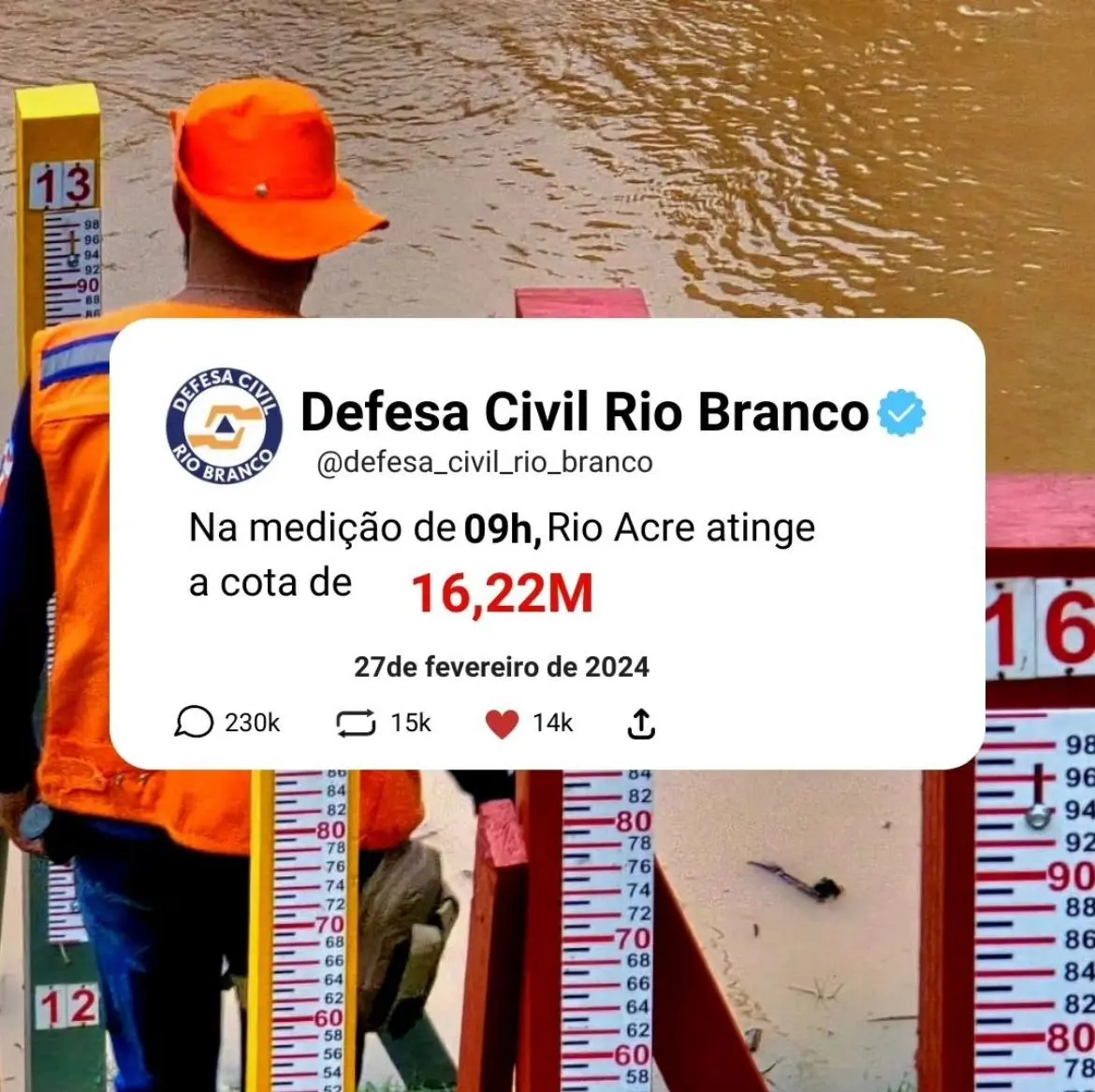 A Defesa Civil de Rio Branco divulgou a nova medição do Rio Acre na capital, que chegou a 16,22 metros, às 9h. Na manhã desta terça-feira (27), o Rio Acre mediu 16,20 metros, ou seja, um aumento de 2 centímetros em três horas.