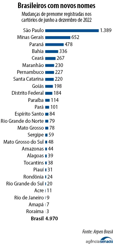 De acordo com um levantamento nacional feito pela Associação dos Registadores de Pessoas Naturais do Brasil (Arpen Brasil) a pedido da Agência Senado, graças à nova lei, perto de 5 mil brasileiros recorreram aos cartórios nos últimos seis meses para mudar o prenome — o que dá, em média, 30 alterações por dia. A entidade não tem o número de pessoas que alteraram o sobrenome.