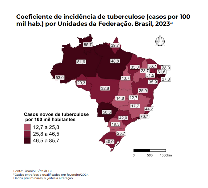 Mesmo com a diminuição no número de novos casos, o Acre ainda aparece como um dos estados com maior coeficiente de incidência de tuberculose por estado, ficando atrás de Roraima, Amazonas e Rio de Janeiro. O Acre aparece com 50 casos novos por 100 mil habitantes, segundo os dados.