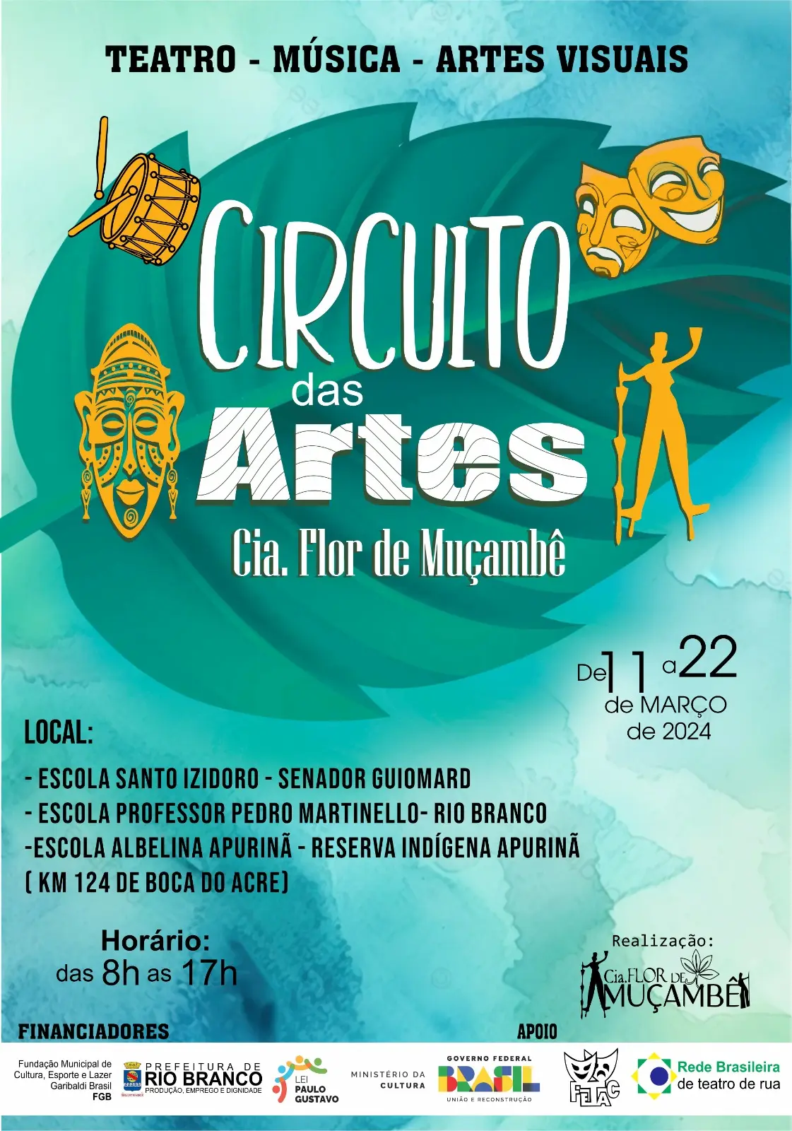 A Cia Flor de Muçambê com sede na Cidade do povo apresenta nos dias 18 e 22 de Março de 2024, o 1° Circuito das Artes- Cia Flor de Muçambê, que leva espetáculos de teatro de mamulengo, teatro de Lambe Lambe, cortejo em Pernas de Pau e exposição de Máscaras Africanas.
