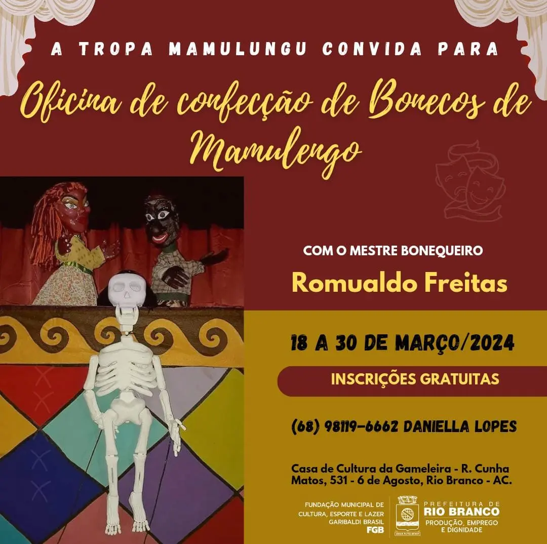 O Mamulengo é a forma popular e tradicional do teatro de bonecos no Brasil. Nasceu nos interiores do Nordeste e, de lá, migrou para grandes centros e outras regiões. A Tropa Mamulungu de Teatro de Rua e Bonecos te convida a aprender sobre o universo dos bonecos de mamulengo com o mestre pernambucano Romualdo Freitas, onde serão criados bonecos de personagens que irão compor o espetáculo Mistérios da Natureza, uma adaptação da obra da mestra Francis Nunes, detentora dos conhecimentos tradicionais e de brincadeiras populares do Juruá.