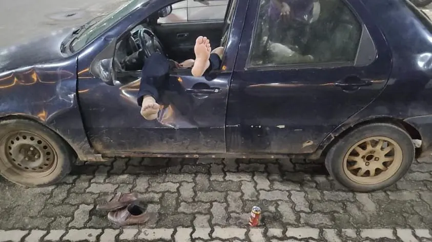 Do lado de fora do carro, uma latinha de cerveja no chão. O homem estaria tão embriagado, que chegou a tirar os sapatos ao entrar no carro para dormir.