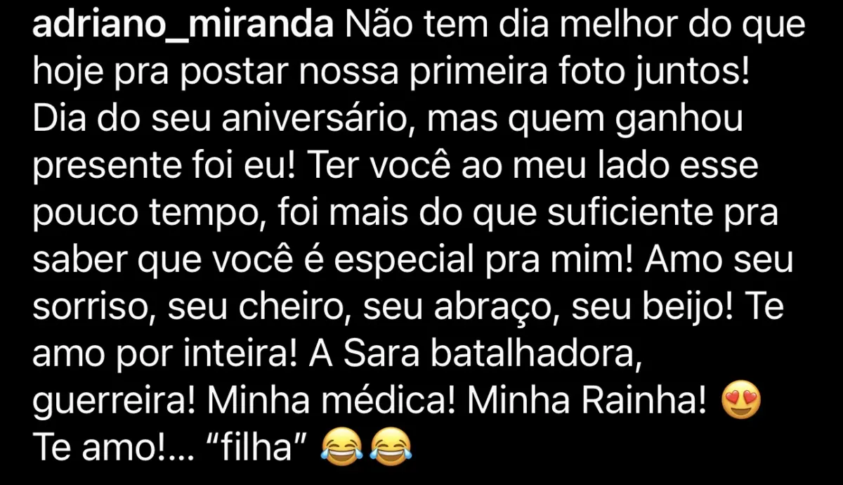 “Não tem dia melhor do que hoje para postar nossa primeira foto juntos! Dia do seu aniversário, mas quem ganhou presente fui eu! Ter você ao meu lado esse pouco tempo foi mais do que suficiente para saber que você é especial para mim! Amo seu sorriso, seu cheiro, seu abraço, seu beijo! Te amo por inteira! A Sara batalhadora, guerreira! Minha médica! Minha Rainha! Te amo!… ‘filha'”, escreveu Adriano Miranda em sua conta no Instagram.
