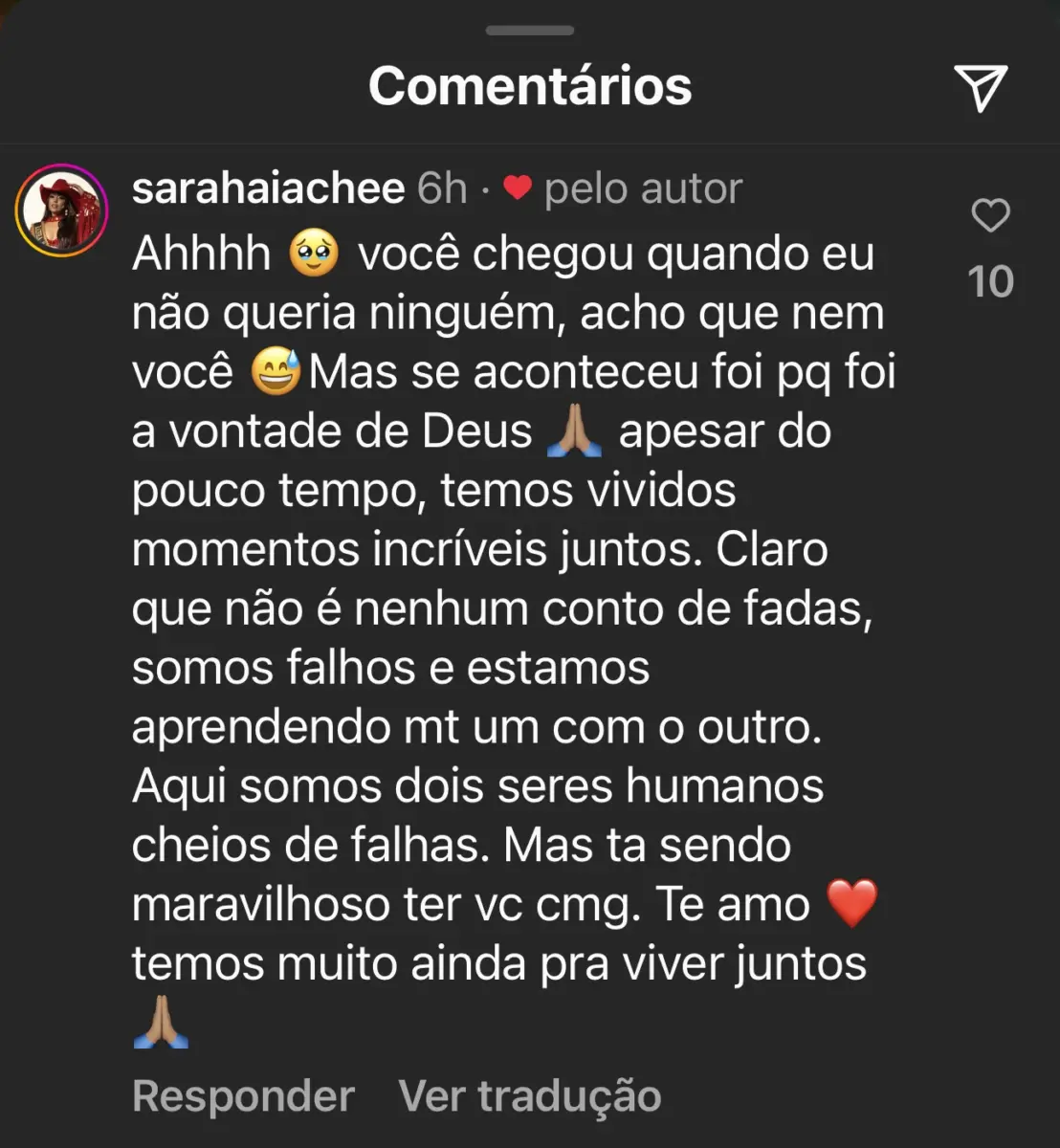 A Rainha do Rodeio 2022 respondeu à declaração do novo amor e comentou sobre o romance: “Ahhhh, você chegou quando eu não queria ninguém, acho que nem você, mas se aconteceu foi porque foi a vontade de Deus. Apesar do pouco tempo, temos vivido momentos incríveis juntos. Claro que não é nenhum conto de fadas; somos falhos e estamos aprendendo muito um com o outro. Aqui somos dois seres humanos cheios de falhas. Mas está sendo maravilhoso ter você comigo. Te amo! Temos muito ainda para viver juntos”, escreveu a rainha.